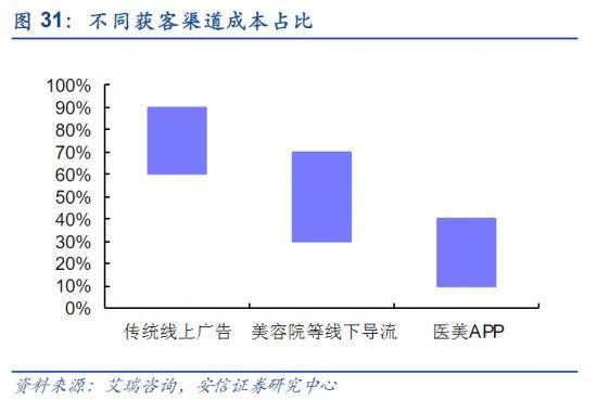 分渠道看,百度竞价等传统线上广告成本占比区间为60%~90%,美容院等线下转介机构成本占比为30%~70%,新氧等互联网平台成本占比区间为10%~30%。