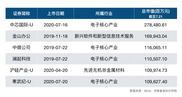 今年以来,前5大宗IPO分别为中芯国际、京沪高铁、N奇安、君实生物、石头科技,融资额分别为532.3亿元、306.7亿元、57.2亿元、48.4亿元、45.2亿元。其中除京沪高铁外均系科创板企业。科创板中的中芯国际、金山办公、中微公司、澜起科技、沪硅产业、寒武纪等更是在短期内成为市值超千亿的科创牛企。