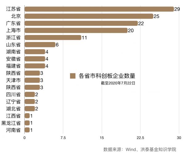 从地域分布上看,尽管多数科创板上市企业大都来自于江苏、北京、广东、上海、浙江等创新能力及资本市场较为活跃的地区,不过包括山东、湖南、安徽、福建等其他13个省市也有部分科创企业成功上市。科创板企业地域分布较广,为推动区域经济发展起到了重要作用。