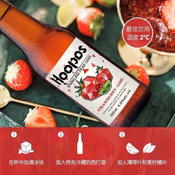 据了解,Hoopos 的产品目前有5款不同的口味(草莓、芒果、百香果、野莓等),和传统的苹果西打酒不同,Hoopos 用梨子作为基底参与酿造,相比苹果的口感能降低成品的酸和涩,让口感更甜。第一批产品已经上市,淘宝店售价20元/瓶,价格填补进口西打酒和本土水果酒中间较为空白的地带,定位水果酒中的中高端。