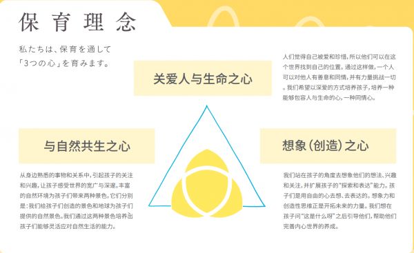 成立13年,品牌形成了一套自己的保育体系——保育13章,包含赋予婴幼儿更多安全感的担当保育制、注重培养孩子表达自己的情感并理解他人的CCD(Child Communication Design)体系、锻炼孩子成长后对艺术的认知和表现的园区设计,和融入实践的日常生活技能培养等内容,根据每个幼儿的特性制定对应的保育方法。