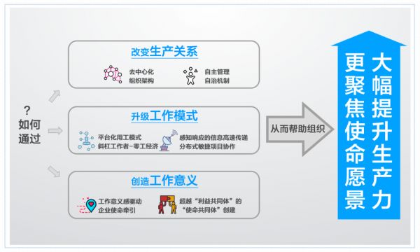以上我列出的组织形态,都不是科层制的变形比如矩阵式、倒金字塔式等,而是彻底的跳脱出科层制而另外生出的新组织形态。这些新的组织形态,通过改变生产关系、升级工作模式、创造工作意义,从而帮助组织大幅提升生产力。