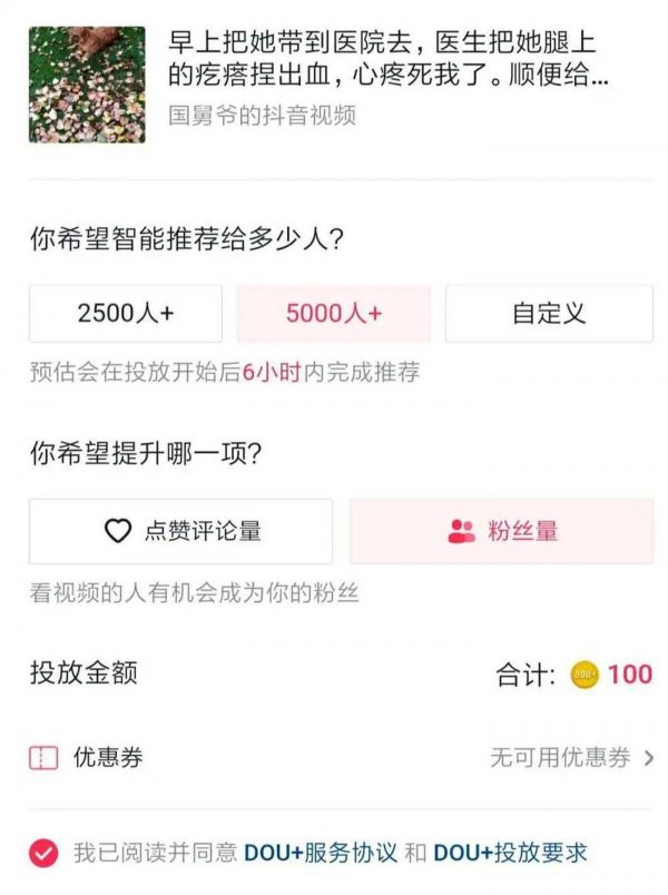 也就是说,DOU+收入在整体抖音营收中占比很小。DOU+本身的投放门槛也比较低,100元起投,可获得5000个播放量,单次投放最高不超过50万,既可以投放自己发布的视频,也支持投放他人发布的视频。