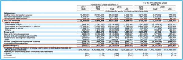 招股书显示,2019年,贝壳集团营收达到460.15亿元,同比增长60.63%,较2018年的12.31%营收同比增速足足增加近4倍。但这个势头在今年一季度受到了影响,截至2020年3月31日的三个月里,贝壳集团营收同比下滑了12.75%,达71.20亿元。
