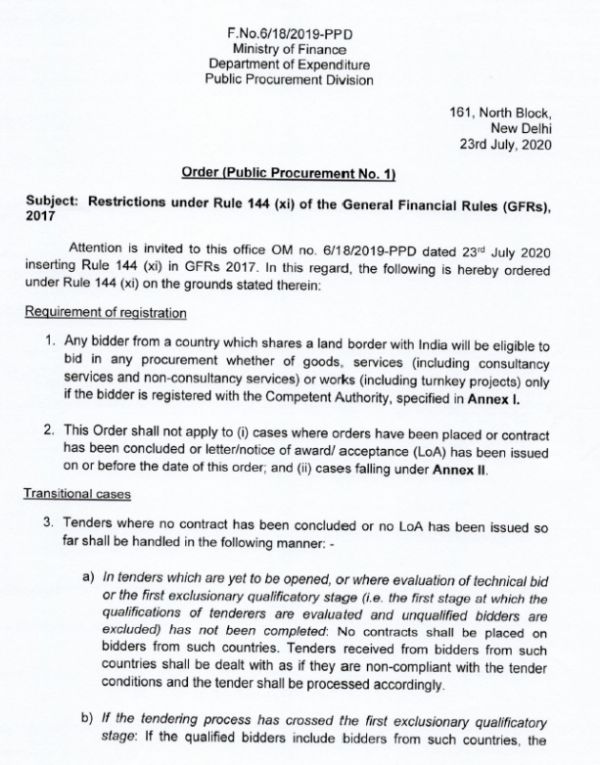 印度财政部以印度防务和国家安全为由,对2017年发布的《General Financial Rules》(财务通则) 进行修改。对来自与印度接壤国家的投标人施加限制,像中国和巴基斯坦等邻国再一次被纳入限制范围。新规定将适用于所有新招标。