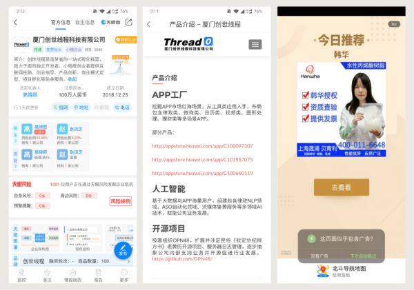通过天眼查搜索开发者「厦门创世线程科技有限公司」发现,这是一家小微企业,业务和产品以 H5 游戏、日历、微商等工具类 App 为主,这些 App 都有着共同的特征——通过植入广告盈利,我在使用「北斗导航地图」的过程中,也发现开屏页和界面上充斥着各种不靠谱的小广告,而除此以外,还有一些类似的「李鬼」App 甚至敢明目张胆的收费使用。