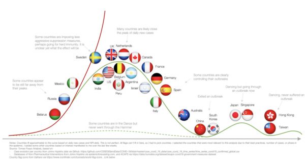 新冠病毒仍在发挥余威,而各个国家与地区正处于「锤子与舞蹈」的不同阶段。新冠病毒仍在发挥余威,而各个国家与地区正处于「锤子与舞蹈」的不同阶段。全球疫情蔓延的第一阶段是从中国开始的,第二阶段是以韩国和意大利为主要代表,然后进入以欧洲和美国为重灾区的第三阶段。随着时间的流逝,中国和韩国已经处在疫情的谷底,美国和欧洲仍然在顶峰,有一些初期控制的比较好的国家,如新加坡,后期又大量爆发,进入舞蹈期。