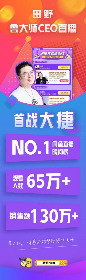根据鲁大师发布的官方战报,田野的首秀登上了闲鱼直播晚间排行第一名,收获了65万累计观看,销售额超过130万,订单数量超过1800,出现了多个超级爆款如戴森V10吸尘器、戴森空气净化风扇、摩飞多功能一体锅等。