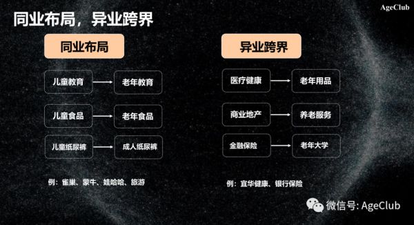 同业布局是指我前面给大家讲过的,很多企业原来做儿童教育现在进入老年教育,做儿童食品的进入老年食品,做儿童纸尿裤的进入成人纸尿裤……这种现象越来越明显,相当于他们把客户人群进行了延伸。比如雀巢、蒙牛、娃哈哈等。