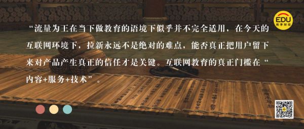 围绕流量,周枫曾公开表达过自己的看法。“流量为王在当下做教育的语境下似乎并不完全适用,在今天的互联网环境下,拉新永远不是绝对的难点,能否真正把用户留下来对产品产生真正的信任才是关键。互联网教育的真正门槛在“内容+服务+技术”。