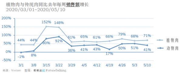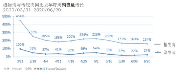 与去年同期相比,无论是植物肉还是传统动物肉产品在美国的销量都有大幅增长,这被归因于新冠肺炎疫情的影响。但我们可以看到,植物肉的增长幅度远大于传统动物肉产品。