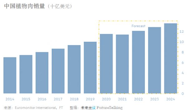根据海外Euromonitor公司的数据分析称:中国以黄豆制品为基础的素肉市场在2019年大约达到100亿美元规模。若除去中商数据中的豆浆、豆浆粉等饮品品类,这两个来源的数据较为一致。也就是在海外研究机构看来,部分重叠于传统豆制品市场,中国确实已有相当于约百亿美元的“植物肉”市场。而美国植物肉市场目前还在10亿美元左右。Euromonitor预测这一领域将继续增长,在2023年中国市场规模达到130亿美元规模。