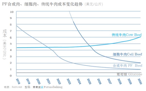 然而,创新技术的成本往往有很大的下降空间,虽存在不确定性,但下降速度也可能超预期得快。前面的数据也显示,2020年相比2019年同期,植物肉在北美市场的售价已有显著下调。RethinkX的研究认为,在称之为精准发酵(Precision Fermentation,PF*)技术发展下,2021年植物肉成本将实现与传统牛肉成本相当,之后还将继续下跌。到2030年植物肉成本将约为当前成本的20%,而传统牛肉的成本未来却将上涨。届时,植物肉成本将远远低于传统牛肉,大约仅是其1/6。