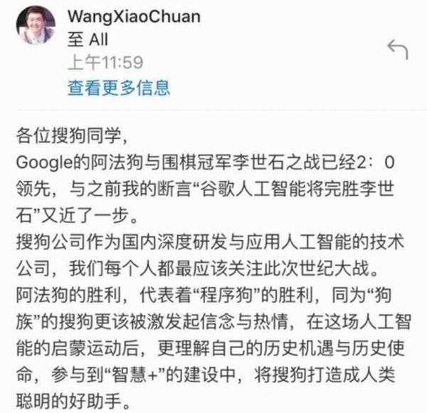 王小川工程师出身,有技术信仰,很早就是头条用户意识到头条的价值。在2016年阿法狗2:0战胜李世石时,王小川还宣布,“在五局比赛中,阿法狗获得第三场胜利的当天定为搜狗‘狗胜节’,狗胜节之后的第一个工作日放假一天。必要工作的同学,另行安排。”