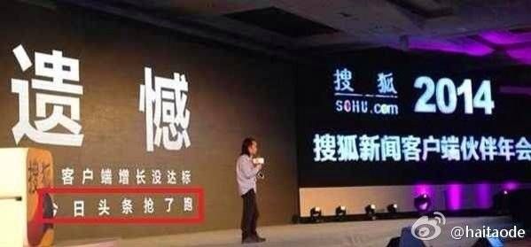 比如在2014年1月,搜狐新闻客户端召开伙伴年会,PPT上写了巨大的两个字“遗憾”:搜狐新闻客户端没达标,被今日头条抢了跑。