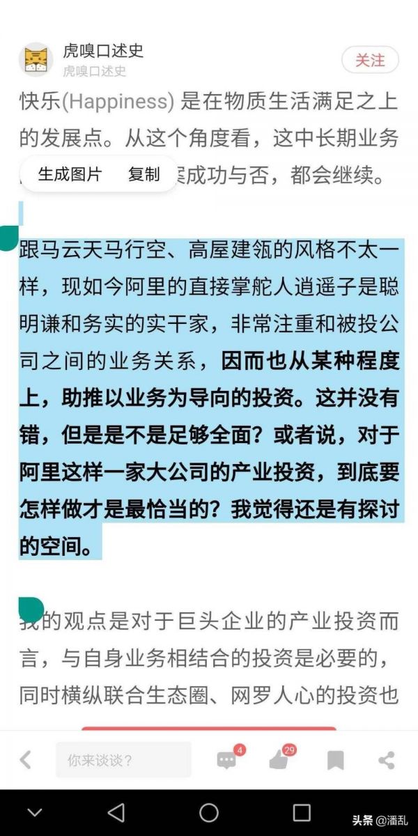 其实曾经在阿里负责产业投资的张鸿平也是这样看的。张鸿平在离职之后,18年在虎嗅发了篇阿里资本操盘手回忆。这位投出了美团、陌陌和微博,还差点投中快手的人,在回忆开头就diss了逍遥子。张鸿平其实是在羡慕腾讯战投。可以不断做非控制,非业务驱动的投资,简单点说就是觉得阿里这个体系留给他的空间太小了。