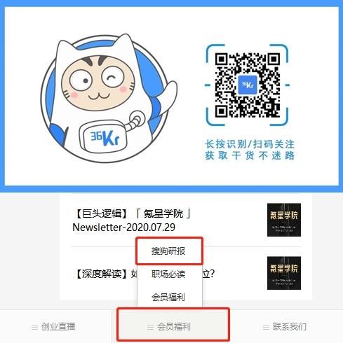 马上关注【36氪会员】服务号,点击底部菜单 or 回复关键字【搜狗】获取本次研报合辑。