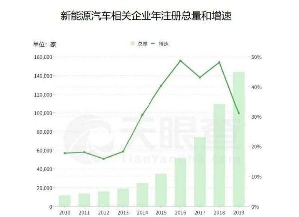 风口期进化出一个迅速膨胀的市场,六年间,大批热钱涌进,上百家造车新势力出现。据天眼查数据显示,我国新能源汽车相关企业注册增速(全部企业状态)自2012年起保持稳定增长,2016增速到达高峰,为48.8%,之后略有波动,2018年再次攀升至次高点,全年新增新能源汽车企业超3.5万家,为历史新增最多年份。