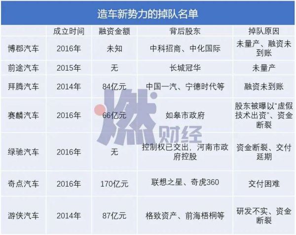 为数众多的造车新势力倒在了IPO及量产前夜,没钱,是压倒他们的最后一根稻草。燃财经根据公开报道和天眼查数据整理了一份“掉队名单”,他们密集成立于2014-2016年间,背后不乏资本支持,有些还有地方政府做背书,但最终没能熬过2020年的夏天。