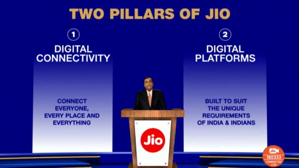 朋友们,Jio现在是印度无可争议的领导者,拥有最大的客户群、最大的数据和语音流量份额,以及覆盖我国纵横交错的世界级下一代宽带网络......Jio的愿景站在两个坚实的支柱上。一个是数字连接,另一个是数字平台。”