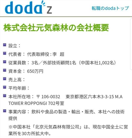 国内第三方平台天眼查明确显示元气森林和北海牧场注册地点都在北京市朝阳区,两家公司相邻。而作为监制的“日本国株式会社元気森林”,在日本一家招聘网站doda上可以清楚看到,“代表人李超”,“中国本社北京元気森林有限公司”字样,总公司在北京,日本的只是分公司。