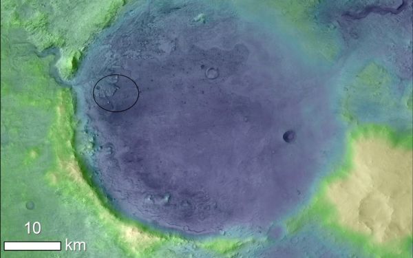 毅力号预定降落的区域。超过 38 亿年前,一条河从这个位置注入 45 公里宽的陨石坑,选择这里当然是为了寻找火星古代存在生命的证据。