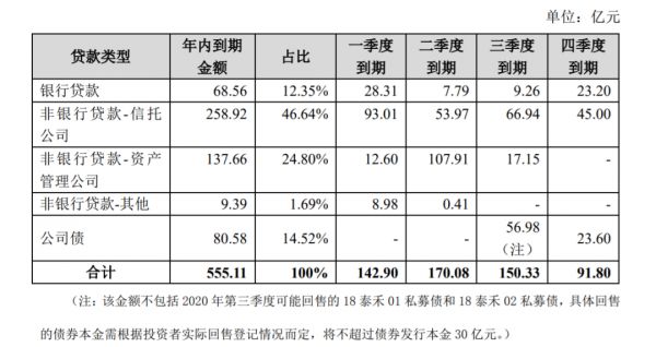 在将于年内到期的555.11亿元债务中,信托占据的比重最高达到46.64%,年内到期金额258.92亿元。其次是资管公司,137.66亿元占比24.8%。公司债和银行贷款分列第三、四位,也有分别超过12%以上的占比。