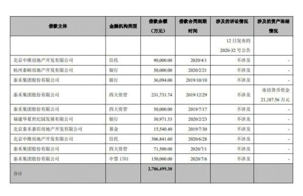 截至7月7日泰禾披露的已到期未偿付债务金额已上升至270.65亿元,占其近一年经审计归母净资产的137.38%。