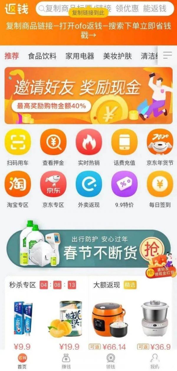 后来互联网金融行业全面收紧,ofo的app就变成了一个购物导流网站,在简陋的“全网返利,购物省钱”开屏字幕后,被拖欠押金的用户就跳转进一个多元的购物界面。