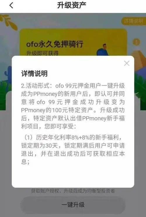 2018年,ofo就给用户指过这样一条路,99元的ofo押金可一键升级为互联网金融平台PPmoney上,100元的特定资产。
