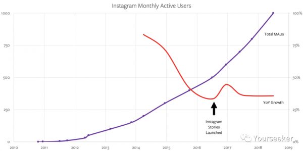 但随后扎克伯格决定直接把 Story 加进 Instagram 和 Facebook,此举直接导致Snapchat 的用户数从每季度增长 18% 到缓步不前。与此同时,Instagram 的数据表现是这样的: