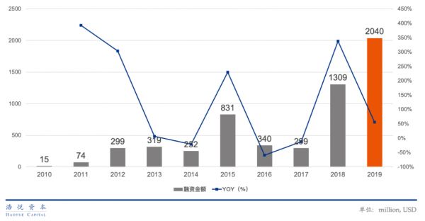 2010-2019年基因疗法领域融资金额及增速(来源:DealForma,浩悦资本整理)