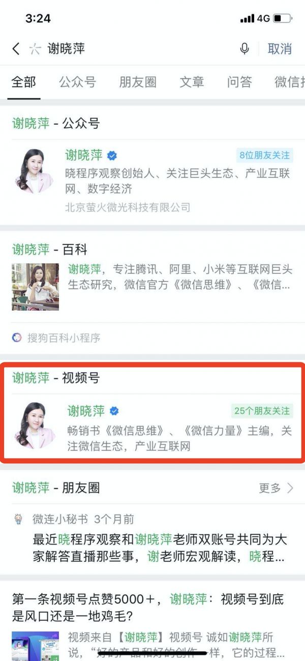 可以猜测的是,如果有名称重合度较高的其他视频号也在搜索结果页里显示,“同台竞技”的情况下,好友关注的数量多的那个,排名会靠前。