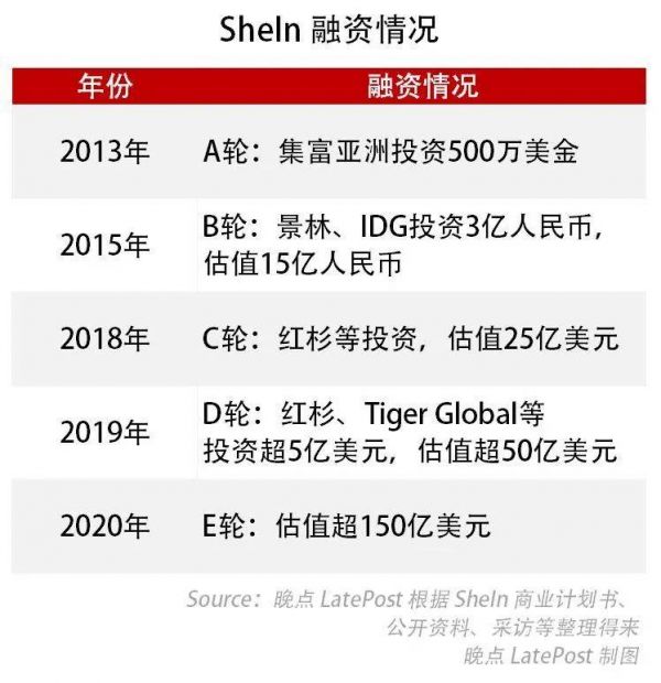 SheIn 的前几轮融资于 2013 年、2015 年、2018 年、2019 年底完成,投资方包括亚洲老牌风投机构集富亚洲、IDG 资本、私募巨头景林资本、红杉资本、Tiger Global、顺为资本等。但上述机构均拒绝了《晚点 LatePost》的采访,原因是配合公司 “低调” 诉求。