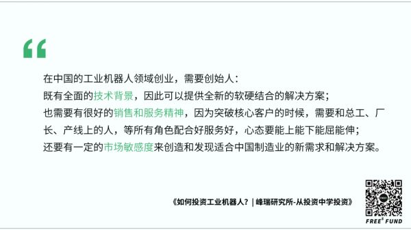 4,在中国的工业机器人领域创业,需要创始人:既有全面的技术背景,因此可以提供全新的软硬结合的解决方案;也需要有很好的销售和服务精神,因为突破核心客户的时候,需要和总工、厂长、产线上的人,等所有角色配合好服务好,心态能上能下能屈能伸;还要有一定的市场敏感度来创造和发现适合中国制造业的新需求和解决方案。