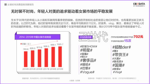 追求颜值与时尚的年轻人群俨然已经成为了时尚品牌的宠儿。根据CBNData《报告》显示,Z世代的线上消费增加明显,对时装消费单品购买平均价702元,平均每年购买15次,对时装SHOW、直播、种草等话题的关注较多。年轻群体对时尚的追求与关注也带动着女装市场的持续发展,预计2019年女装市场销量破千亿。