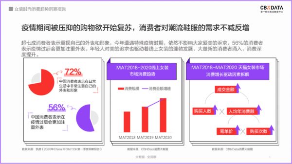 随着疫情形势逐渐平稳,在疫情期间被压抑的购物欲也在逐渐复苏,超一半的消费者表示在疫情过后会更加关注外表。对女装时尚来说,疫情影响下,大量的新消费者从线下转到线上,未来市场依旧充满期待。