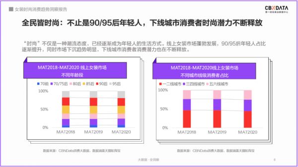 CBNData《报告》发现,2020年天猫“时装周”同款女装对比前两年消费可观,消费规模急速上涨,具有独立经济来源和较小生活压力的90前群体成为时装周女装消费的主力军。