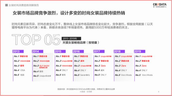 CBNData《数据》显示,2013-2019年天猫女装畅销TOP5排行榜中,具有独特设计感的时尚品牌一直受到年轻消费者的欢迎。根据全网数据(以天猫等电商平台为代表)来看,韩都衣舍连续7年销量领先,一直占据天猫女装畅销品牌排行榜前三,吸引超5000w年轻消费者的关注。