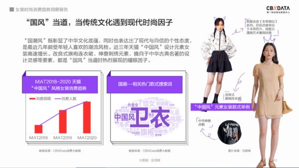 根据CBNData《报告》显示,“中国风”风格女装消费持续走高,从“国潮”相关搜索热词来看,卫衣、T恤、旗袍等服装在国潮中广受关注,将国风中的韵味及元素融入到现在潮流服装中,在潮流服饰的舒适简洁中改变传统国风服饰的穿搭繁琐。