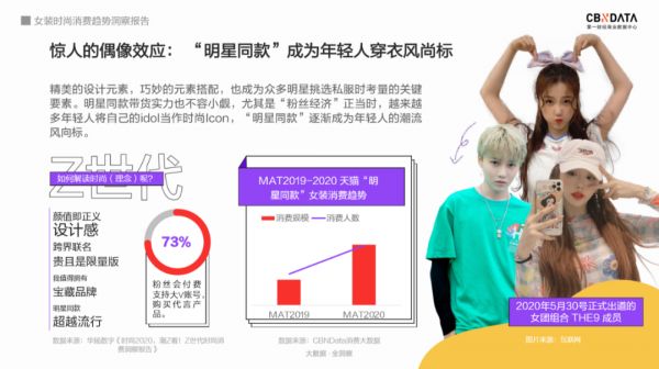 CBNData《报告》展示,2020年“明星同款”女装消费对比去年消费规模和消费人数都增长显著,明星群体的经济影响力和时尚感染度都在增加。从热播综艺《青春有你》出道的THE 9组合成员虞书欣就是一位带货达人,率真的“哇哦”引来粉丝纷纷效仿,也带动着“虞书欣同款”的销量一路飙升。
