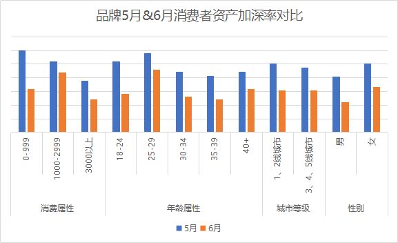 先来看一个数据指标——加深率。所谓加深率,是指与品牌关系加深一步的消费者占比,包括消费者从A到I、从I到P、以及从P到L。从下图可以看到,该品牌6月加深率整体下降,消费者与品牌的距离更远了,说明用户转化出现很大问题。