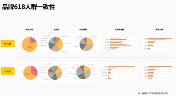 原因何在?除了618竞争激烈,还有一个重要的原因——投放人群没有投对。基于阿里数据体系,我们可以对有不同行为特征的消费者人群属性做透视。可以看出,该品牌618期间“A人群”与“PL人群”有很大差异:品牌实际购买用户中女性超70%,然而投放影响的用户中女性占比仅超52%;品牌实际购买用户偏年轻,但投放影响更多的是年龄层偏大的用户;城市等级上,实际购买用户中更多来自一二线城市,但更多面向低线人群投放;消费金额上,实际购买用户是淘宝中消费力较高的人群,但投放时候更多面向低消费能力人群。