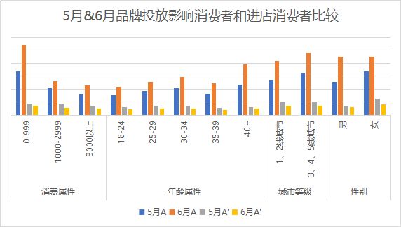 用户转化的问题从何而来?我们进一步看该品牌5、6月投放影响消费者(A柱)和进店消费者(A'柱)人群数量的对比。可以看到6月比5月影响的人群数量高很多,但进店人数却更低了。说明投放量增加,但进店数反而降低。