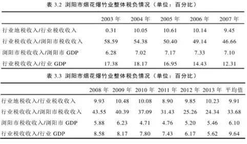 花炮产业是浏阳市的税收主要来源,2003年至2007年,行业税收收入占整个浏阳市税收收入的一半左右。[1]同样的情况也发生在江西万载县,2001年,万载全县财政收入为1.2亿元,其中花炮行业税收达6000万元。[2]