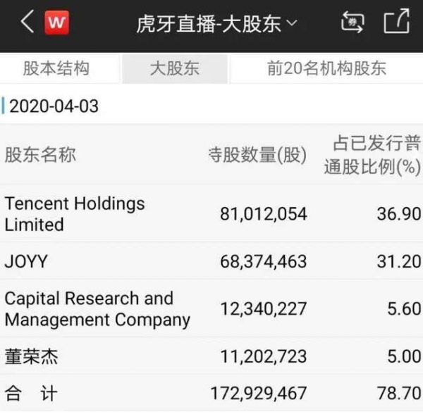 虎牙则成立于2016年,腾讯为其B轮阶段股东,截至2020年4月3日,腾讯持有虎牙36.9%的股权,同样为其第一大股东。
