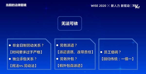 二法律的困境,在现有法律框架或者法律环境下,我们的灵活用工面临着怎样的挑战?企业经常问律师这样做行不行,我们这样做有没有风险。有的创业者还会问,我想到这么一个人力资源服务的模式或者是业务方向,律师你帮我们评估一下,有什么样的风险在这里面。考虑问题的时候,律师只能依据现有的法律法规,去探讨这些问题。而实际上这些问题如果套到现在的法律框架下,确实存在挺多的困惑或者疑惑。