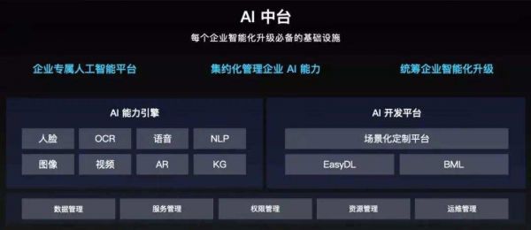 比如,百度智能云,提出的AI中台就包含了AI能力引擎和AI开放平台,前者集中了人脸识别、OCR、语音识别、NLP、图像识别、知识图谱、深度学习等多项AI能力;后者还包含场景化定制开发平台的EasyDL和BML。百度正是以AI中台的通用能力,为自身的业务和客户提供AI技术的支撑和协调。