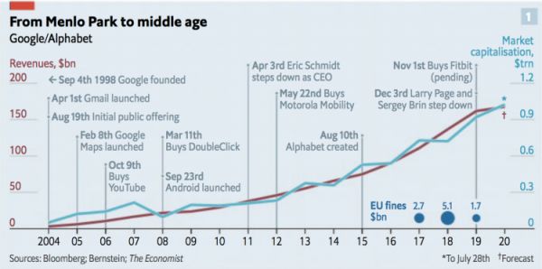 《经济学人》近期的报道认为,谷歌虽拥有 Chrome、Youtube、Gmail 等明星产品,在网络广告领域占统治地位,母公司Alphabet一年赚340亿美元,人工智能、量子计算和自动驾驶汽车领域也世界领先,但主要业务进入瓶颈期,新蓝海没有突破性成就。