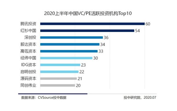 CVSource投中数据显示,2020上半年,腾讯投资、红杉中国、深创投等知名机构的出手甚为活跃。其中,腾讯投资6个月内出手60次,平均每个月出手10次,即每3天出手1次;红杉中国6个月内出手54次,平均每个月出手9次,即每3-4天出手1次。